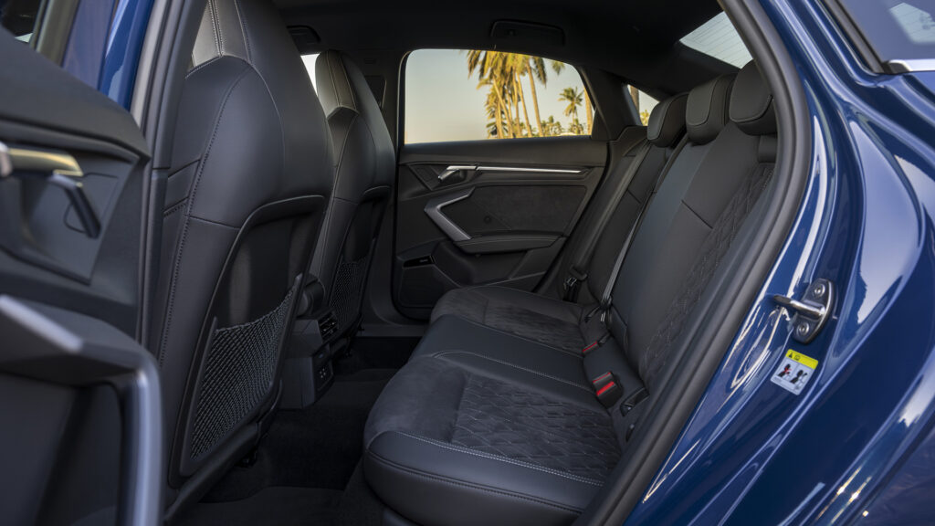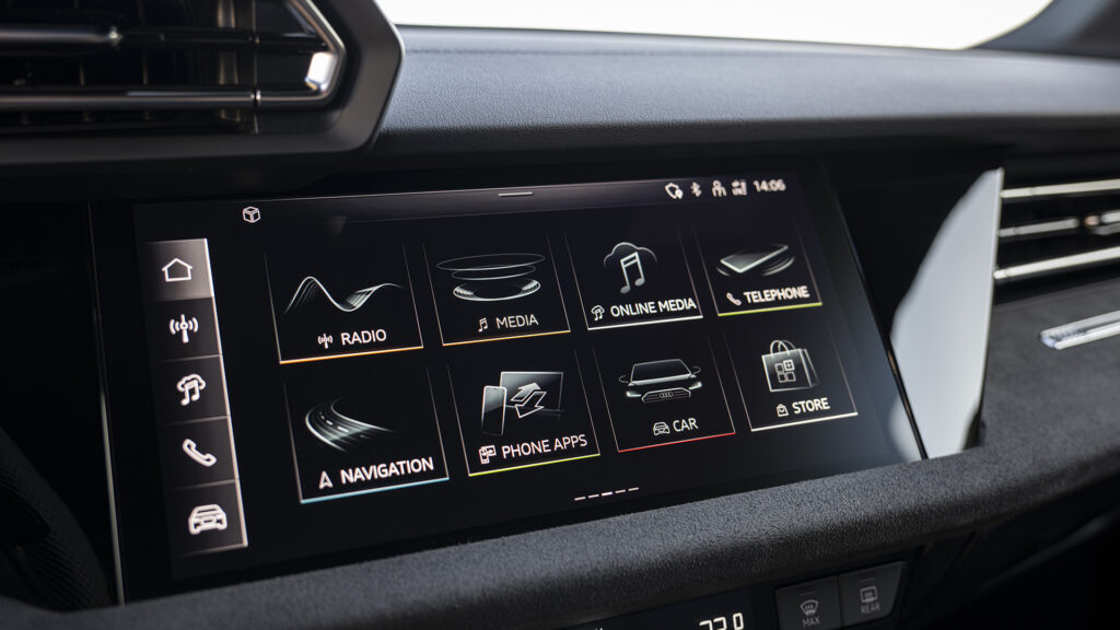 A tela multimídia é responsiva e conta com ótimos gráficos; eu adoro o Audi MMI Navigation Plus. É um dos meus sistemas favoritos disponíveis no mercado. Há até mesmo um teclado para procurar os destinos. O sistema multimídia, que integra a Alexa, é funcional e fácil de usar. Como novidade para 2025, a linha passa a ter acesso à Audi App Store. Os assentos são de couro e muito confortáveis, embora os traseiros sejam um pouco incômodos.