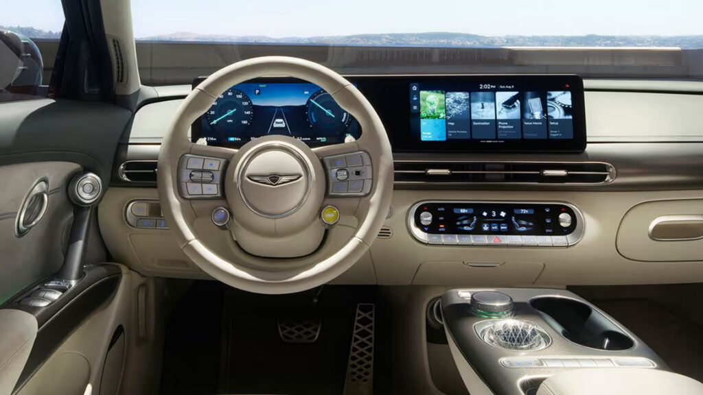 As luzes no interior dos modelos Genesis são umas das melhores luzes do mercado o GV60 2025. Elas estão espalhadas por todo o espaço da cabine, incluindo debaixo dos bancos, ao redor dos apoios do braço e nos contornos de vários botões do painel. O melhor de tudo é que você pode personalizar as cores no menu de configurações para obter o clima exato que deseja. O preço do novo Genesis GV60 começa em $52,350.