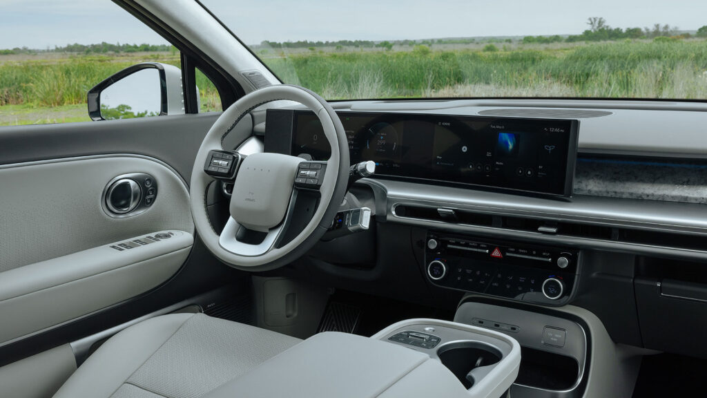 Já está virando moda carros elétricos com três fileiras de assentos e o Hyundai EV9 não ficou atrás, sem sacrificar o conforto dos passageiros. Os materiais empregados são de alta qualidade em todo o veículo desde as maçanetas ao porta-copos. Estão disponíveis dez airbags frontais, laterais, de cortina lateral, de joelho e no centro do banco dianteiro. As portas e janelas estão seladas com vidros acústicos triples que absorvem o ruído externo, principalmente na estrada.