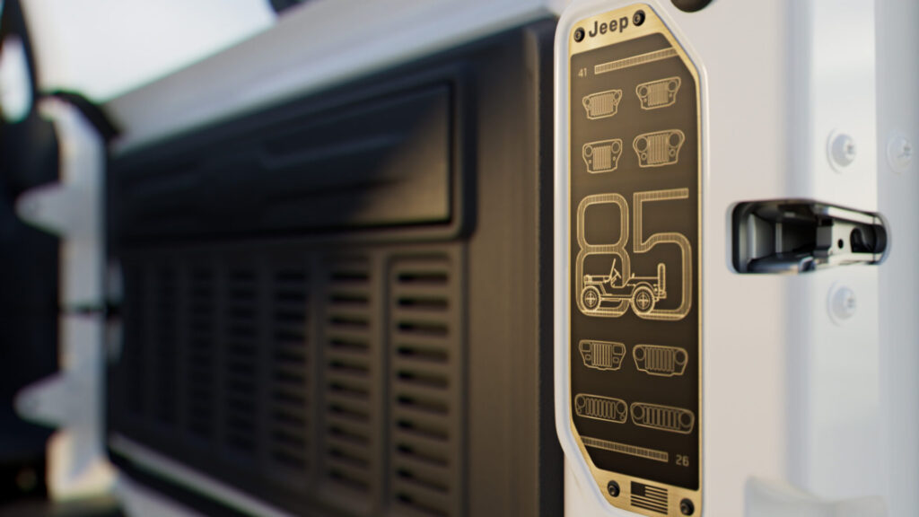 Desde o momento em que se fala no Jeep Wrangler 85th Anniversary Edition, a presença marcante do veículo é evidente: visual diferenciado com rodas pintadas em Steel Oxide, ganchos de reboque bronze e decalques “Blue Agave” que celebram este marco histórico. No interior, o retorno dos bancos com revestimento xadrez — um detalhe clássico que remonta a versões históricas — ganha uma representação moderna, realçada pela plaquinha comemorativa e pela medalha “85” no manípulo de câmbio, sinalizando uma edição definitivamente icônica.